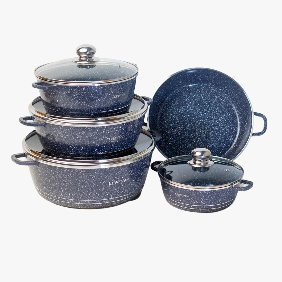 Lefon cookware sets are typically stylish, affordable, non-stick, and feature a granite coating, offering a complete kitchen solution with pots, pans, glass lids, and sometimes utensils, designed for everyday cooking on various stovetops (gas, electric, ceramic) with easy cleanup and a focus on healthy cooking with less oil. They often come in sets of 10 or 14 pieces and feature modern colors like black with red or blue accents, targeting home chefs looking for value and performance.